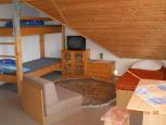 Chalupa má dva oddělené apartmány v patře. V každém jsou 4 lůžka s možností jedné přistýlky. Prostorná obývací ložnice a jídelní kout. Kuchyně - lednička, elektrický sporák, mikrovlnná trouba, varná konvice. Sedací souprava, TV, CD přehrávač, krbová kamna. Koupelna se sprchovým koutem, umyvadlem a WC. Pro ubytování většího počtu osob je možné využít ložnici se 4 lůžky (palandy), která nemá svoje sociální zařízení. V přízemí je sklípek s příjemným posezením. Topení v krbových kamnech na tuhá paliva a elektrické v samostatné ložnici a sklípku. K každému apartmánu vede zvláštní samostatný vchod. Neoplocená zahrada s okrasným rybníčkem a posezením, krytá venkovní terasa, ohniště, pingpongový stůl. Parkování v létě u chalupy, v zimě 80m nad chalupou (doporučené sněhové řezězy). Možnost zapůjčení dětské postýlky zdarma po předchozí domluvě. Restaurace 800m, obchod 3km.